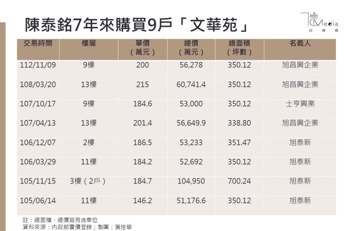 事實上,陳泰銘家族累積持有「文華苑」至今已達到9戶。過去幾年陳泰銘家族猶如「集郵式」買樓,只要「文華苑」有出售就進場接手,從近幾年的交易紀錄顯示,最早是從2016年6月開始,當時以約5.12億元、每坪單價約146.2萬元購入文華苑11樓戶;至今已陸續取得3、9、11、13樓整層二戶,以及2樓一戶,共9戶,累計投入成本金額約48.87億元。