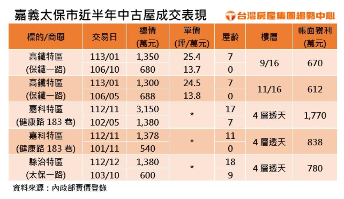 根據內政部實價揭露,位於太保高鐵特區一棟屋齡7年的中古大樓,今年1月,9樓戶以每坪單價25.4萬元,含車位總價1350萬元成交,然而賣家在7年前僅以每坪13.7萬元、總價680萬元入手,如今以近翻倍價格轉手,增值約670萬元;同社區11樓戶的獲益同樣驚人,賣家原僅花688萬元入手,持有7年,每坪房價從13.8萬元翻漲至24.5萬元,以總價1300萬元成交,增值約612萬元,單從帳面來看,上漲金額已與當初購屋總價相當,等於是賣一間又多賺一間。
