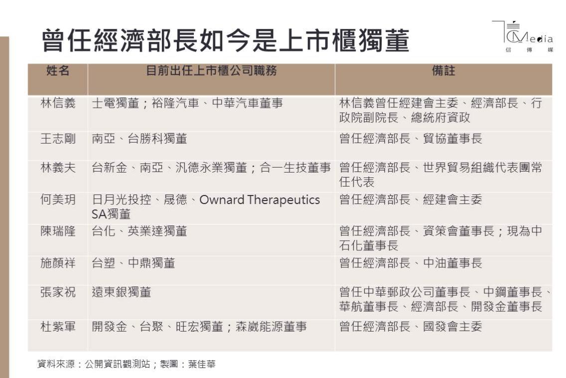 前經濟部長王志剛目前也是南亞、台勝科獨董;前經濟部長林義夫則是台新金、南亞、汎德永業的獨董,也是合一生技的董事;同樣是前經長的何美玥目前則擔任日月光投控、晟德以及Ownard Therapeutics SA獨董;另外,陳瑞隆目前是中石化董事長,也是台化、英業達的獨董;至於施顏祥則是台塑和中鼎的獨董。