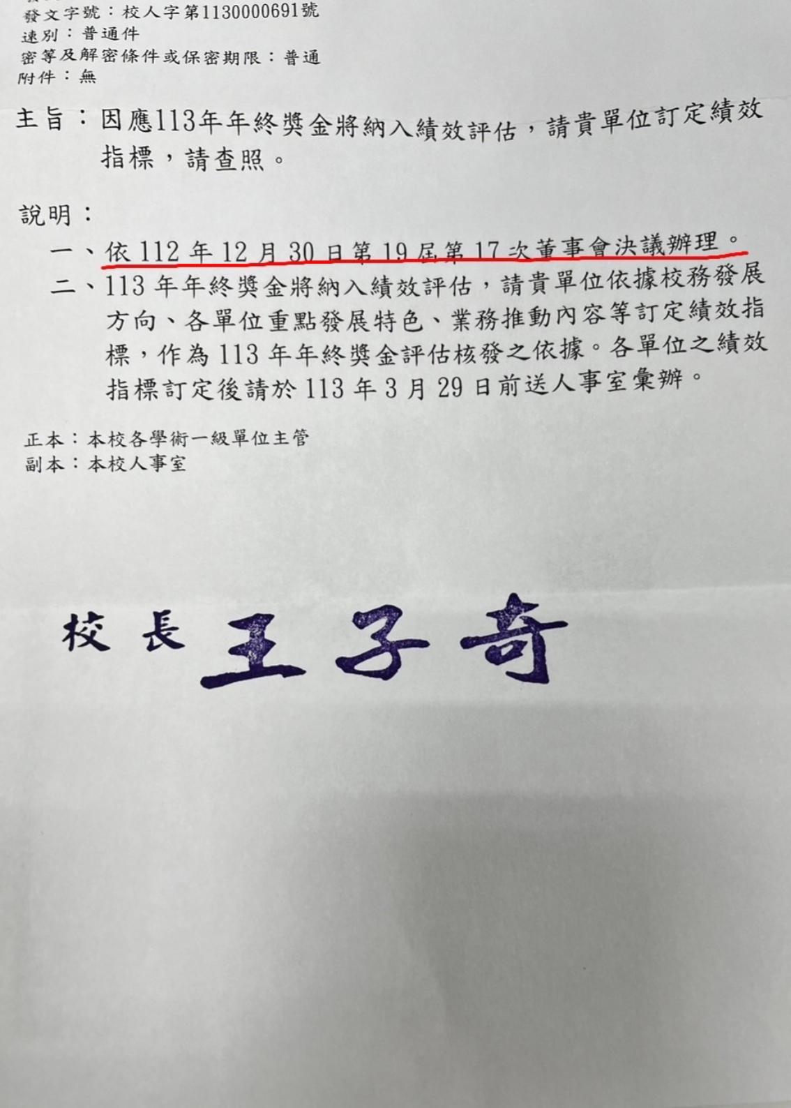今年3月初,文大校長王子奇對校內一級主管發出一紙主旨為「因應113年年終獎金將納入績效評估」的公文,明確表示此一對教職員勞動條件的片面變更,乃是「依112年12月30日第19屆第17次董事會決議辦理」。