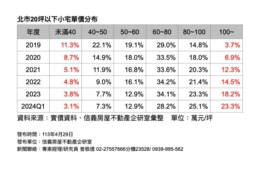 統計顯示,台北小宅單價越來越高,今年第一季全部住宅中有14%單價超過百萬,不過20坪以內單價超過百萬的比例就高達23.3%,顯示單價百萬的交易特別容易出現在小宅產品,且2019年只有3.7%小宅單價超過百萬,去年新青安上路後就呈現快速攀升,去年百萬小宅的占比已經占了小宅的18.2%,今年第一季更攀高到23.3%,每5間20坪以下的小宅交易,就有超過一戶單價百萬。