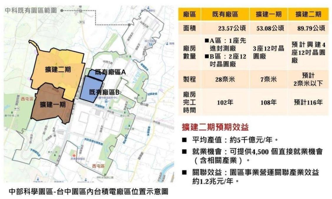 按照規劃,台積電二期用地由中科學管理局取得後,再由台積電承租,預計興建4座12吋晶圓廠,原本是要在民國116年,也就是2027年完工進入量產,本來將和日本熊本二廠同一年啟用量產,目前看來啟用時間將落到2028年。比較可能和美國亞利桑那州的第二座晶圓廠同一年度啟用,因為該廠也是進度延宕。