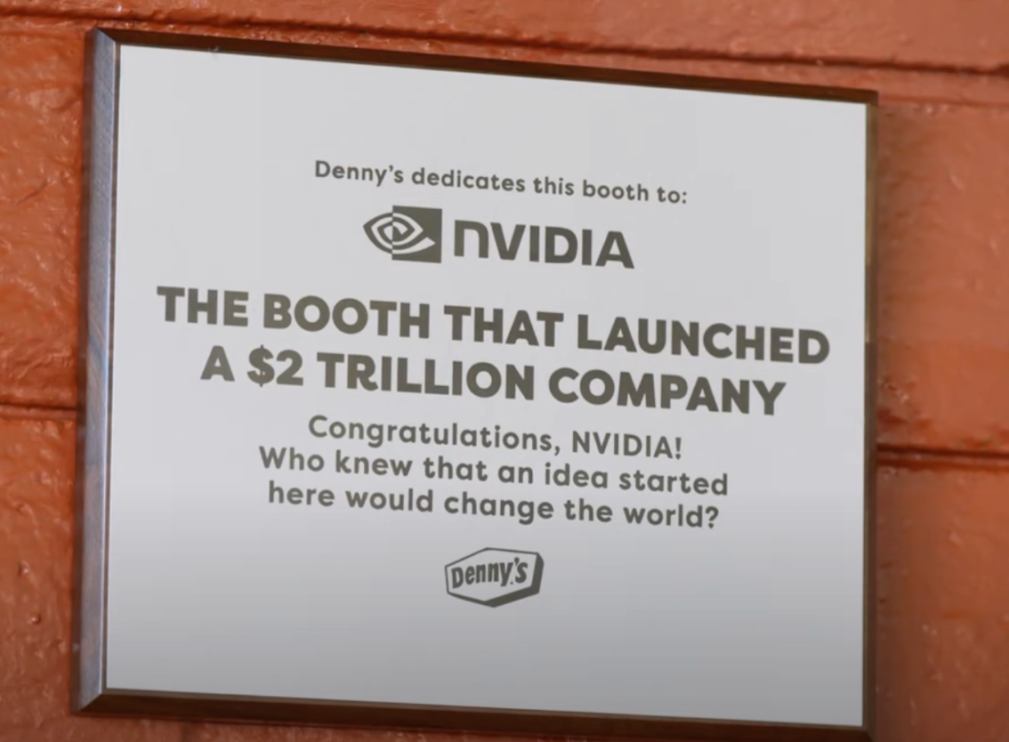 Denny’s也曾邀請黃仁勳回來矽谷接受表揚,聖荷西店甚至在當初他們常坐的位置牆上釘了一塊紀念碑寫著「創立兩兆美金公司的座位」。