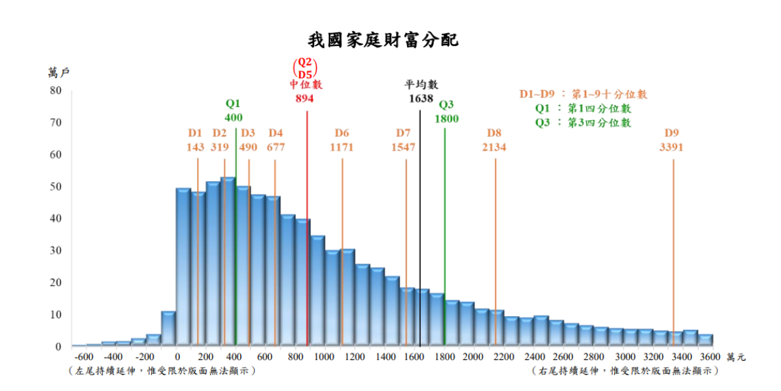 進一步觀察主計處統計,110年底,每個家庭財富平均數為1,638萬元,中位數為894萬元,其中約有7成民眾未達平均數,並且如果將全國家庭財富由低至高分為5等分,前20%富有的家庭,掌握超過6成(62.68%)的財富,與其對比,家庭財富最低的後20%家庭,佔不到1%(0.96%)。