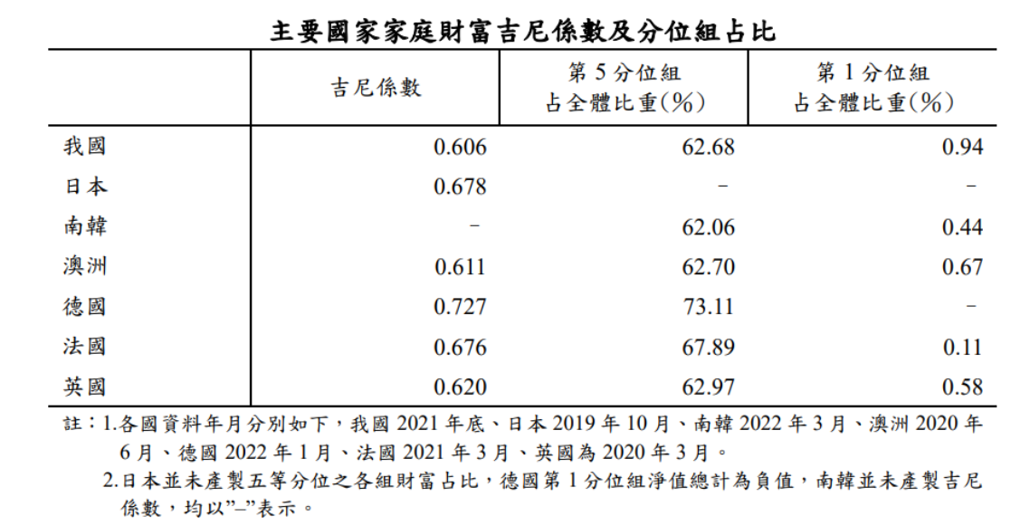 雖然調查方式不一樣,但主計處還是跟有發布該項統計國家相比,並認為,我國家庭財富分配更為均勻,最低的20%家庭,家庭總財富占全體0.94%,高於韓、澳、法、英等國;而最高的前20%家庭財富占全體62.7%,與南韓、澳洲及英國相當,低於德國及法國。