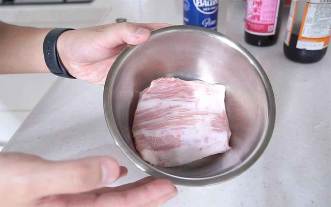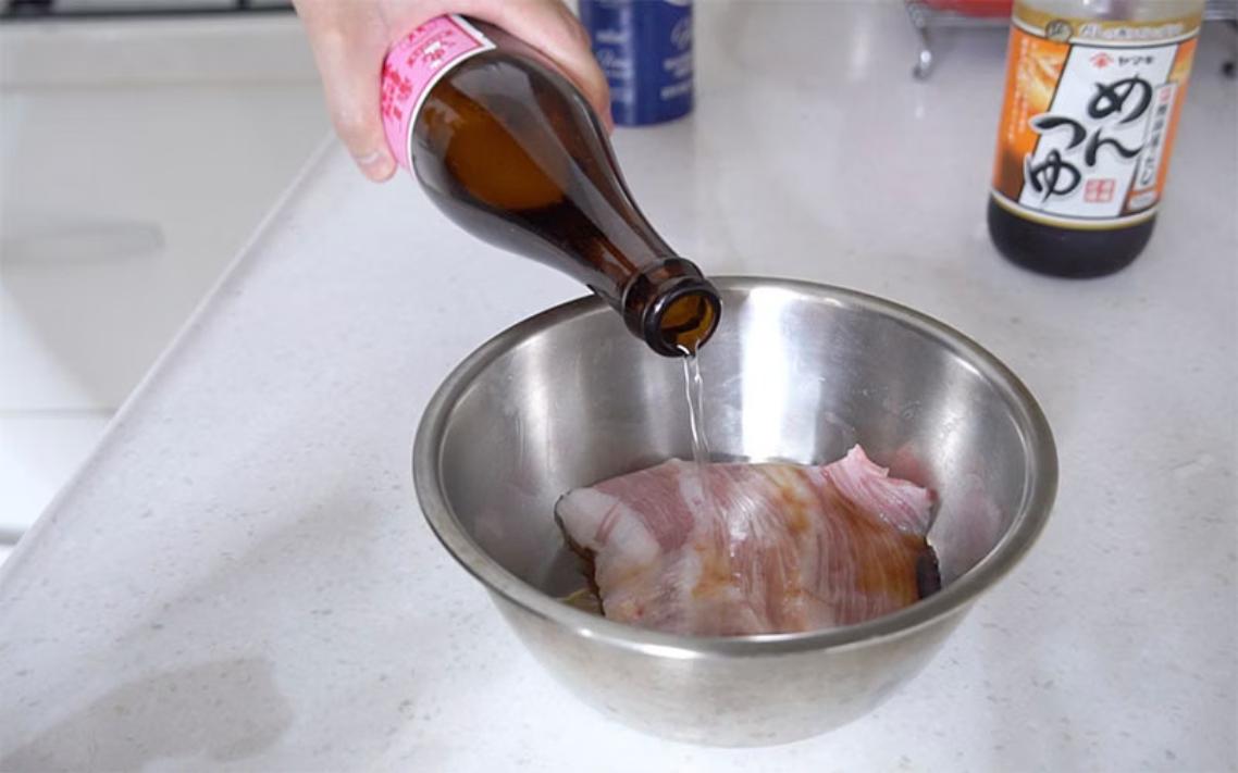 首先先將「整塊豬肉」稍微醃漬入味。加入鹽巴、醬油1大匙、米酒1大匙。塗抹混合均勻,靜置5分鐘左右即可。也可放入冰箱保存1~2小時更加入味。