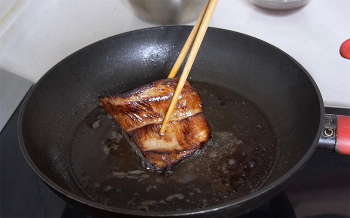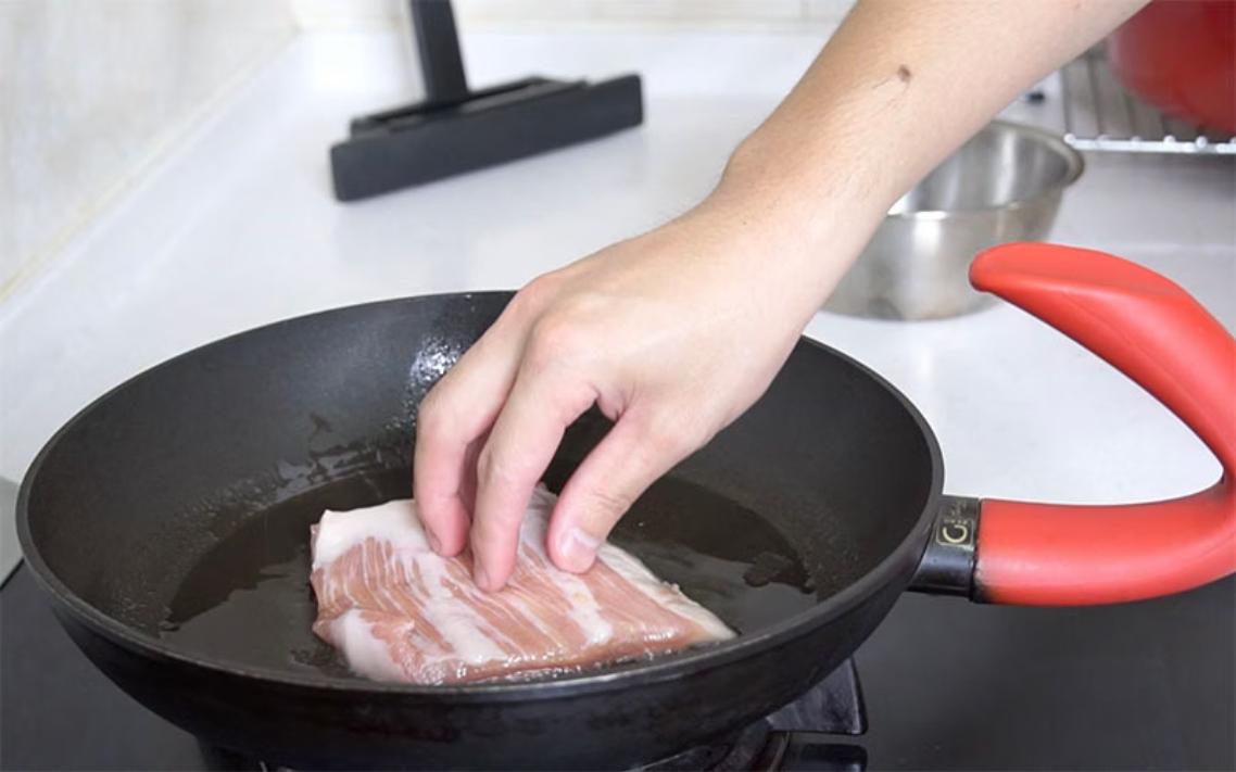 利用筷子均勻地將肉的每個角落煎均勻上色。