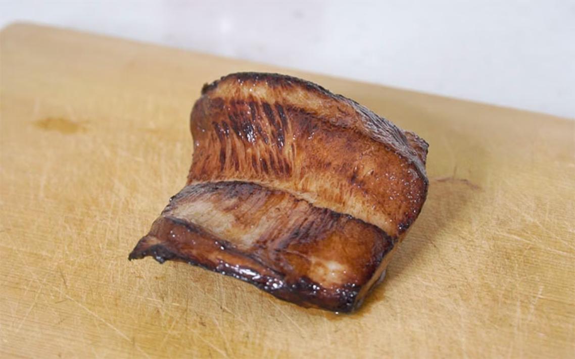 整塊松阪豬下去煎,過程因為肌纖維的收縮,豬肉塊會變得不平整。