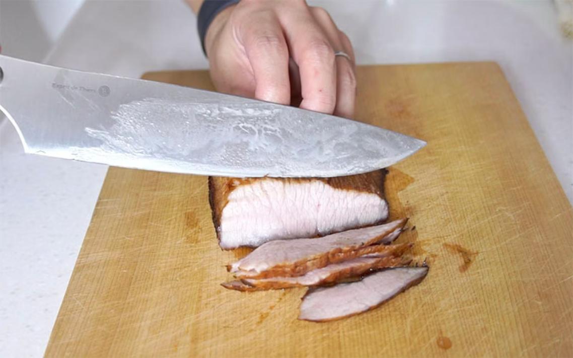 將松阪豬切片,要記得逆紋切喔,這樣松阪豬的口感才好。