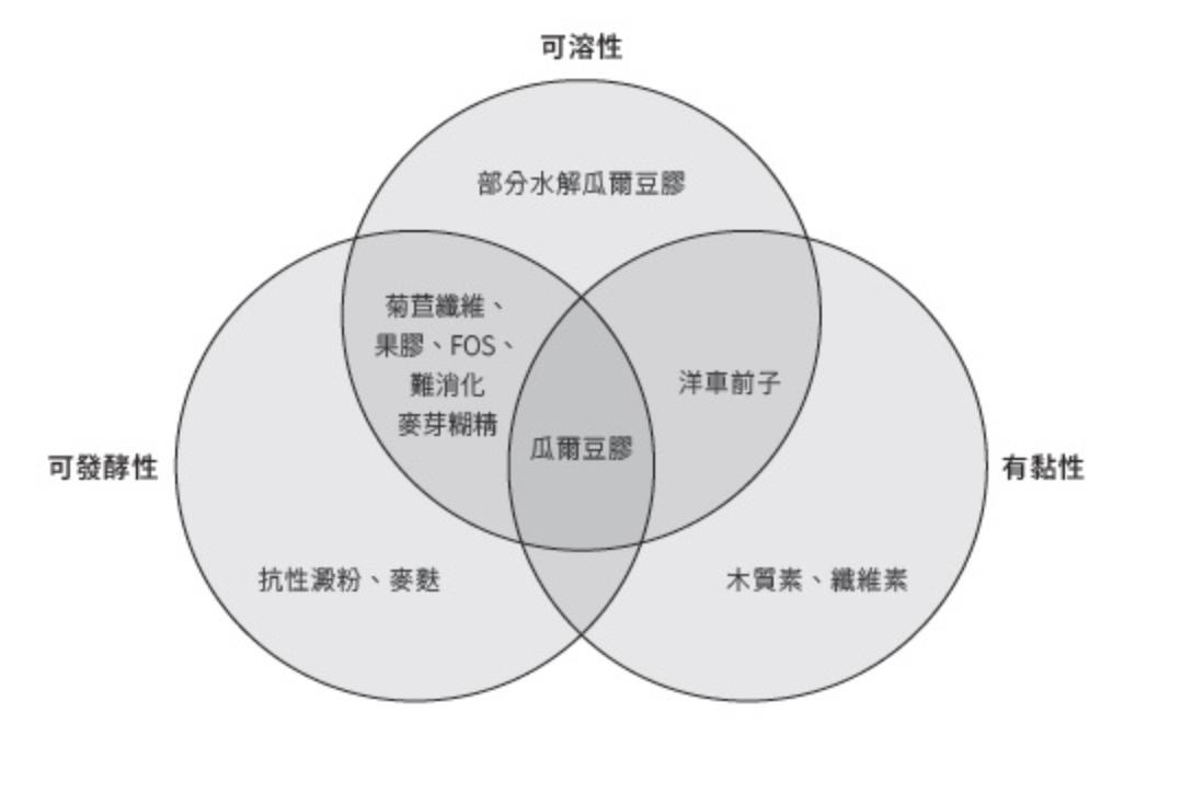 菊苣纖維(inulin)、菊粉型果聚糖 (inulin-type fructans)、反式乳寡糖(trans-galactooligosaccharides)和果寡糖(fructooligosaccharides, FOS)、L- 阿拉伯糖也屬於此類。這類短鏈的碳水化合物有利於雙歧桿菌的增加,但也可能因產生太多氣體而造成腹脹問題。另外,有些是同時具有水溶性、黏性、發酵性的其中幾中重疊分類,示意圖如下: