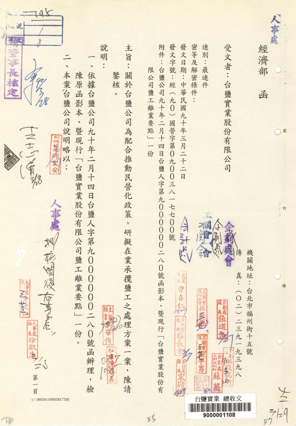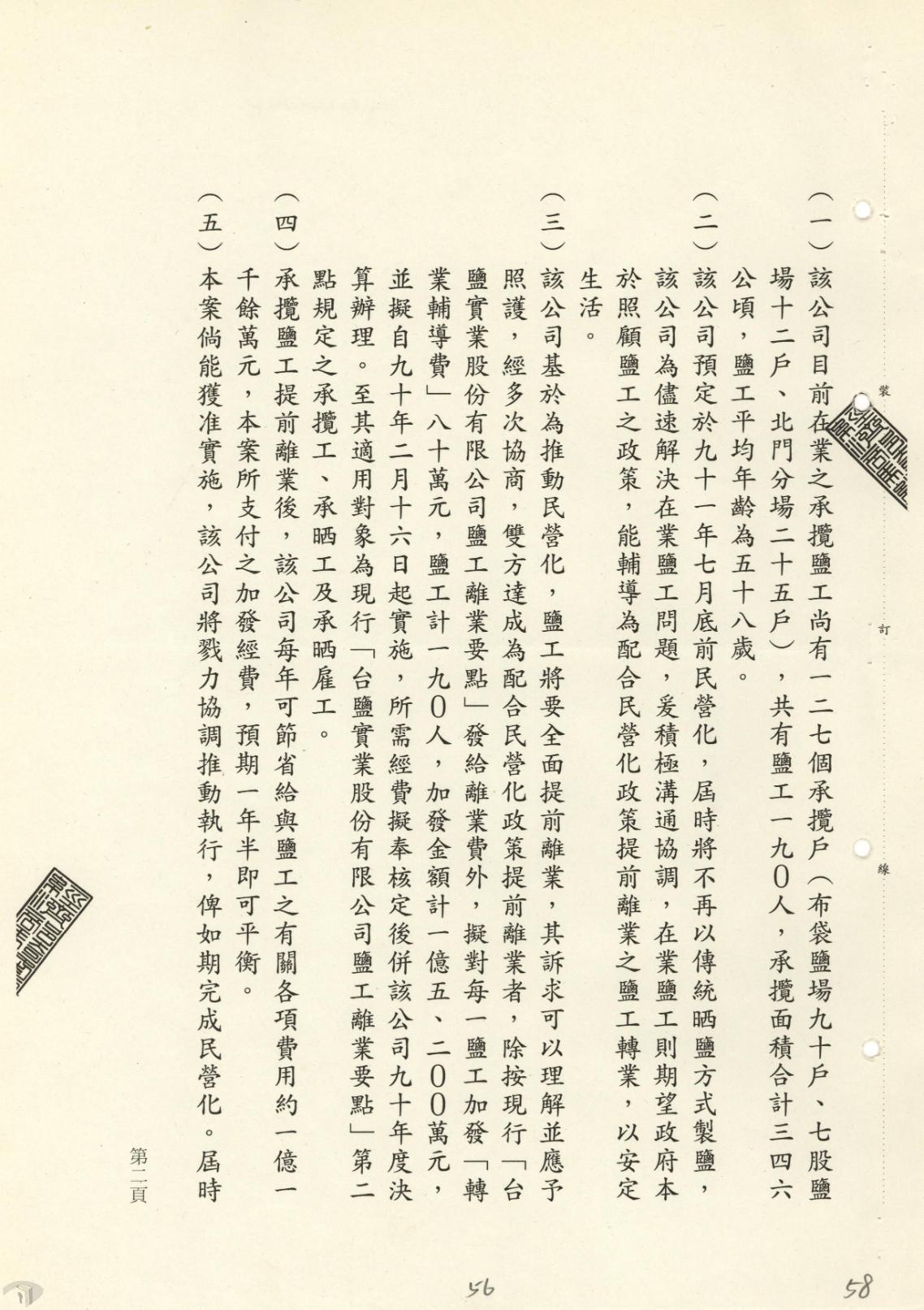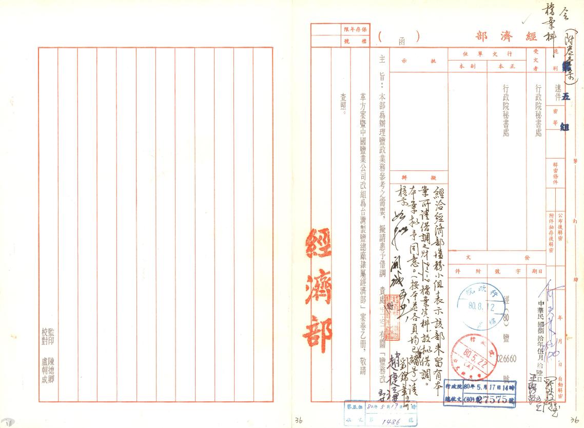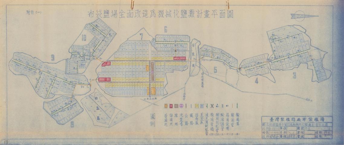 二戰後,臺灣省行政長官公署成立「日產處理委員會」,接收原臺灣製鹽與南日本鹽業兩大會社後,設立臺南鹽業公司,分別成立鹿港、布袋、北門、七股、臺南、高雄等六大鹽場,後再改隸財政部臺灣鹽務管理局,1947年廢止專賣,改行徵稅制,同時頒布「鹽政條例」,鹽的產銷統一由國家獨占經營;嗣後改為中國鹽業公司臺灣分公司,1951年清算解散,改組為臺灣製鹽廠並改隸經濟部(圖5);1953年正式定名為「財政部鹽務總局臺灣製鹽總廠」,負責全臺鹽業生產與經營。