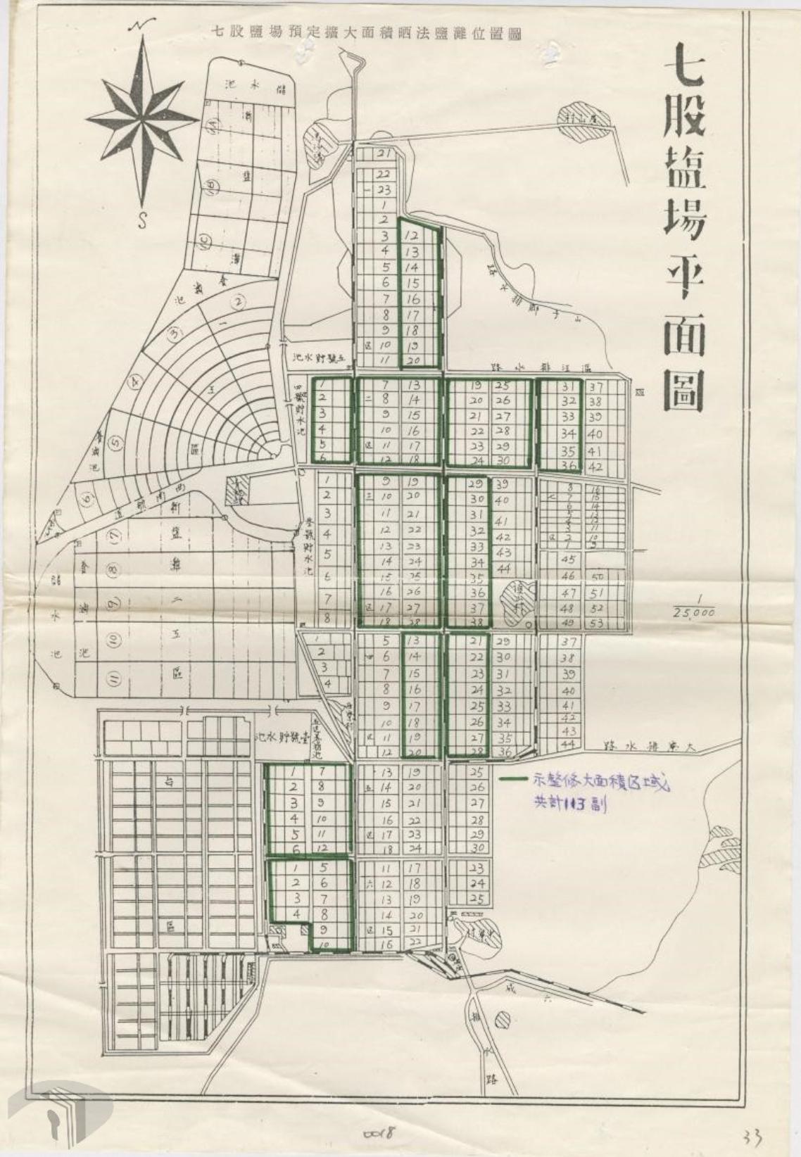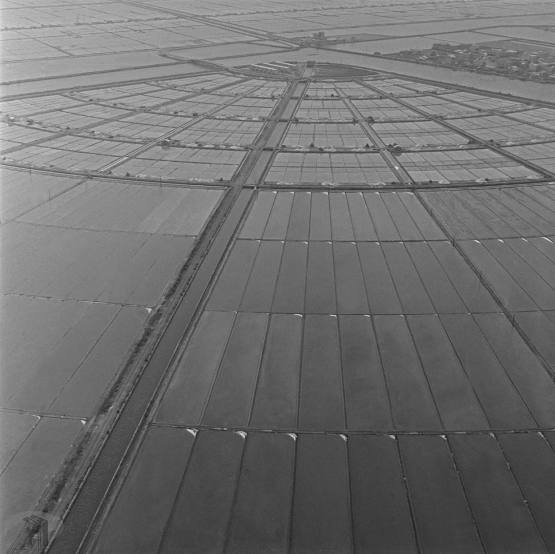 臺灣鹽田開發以「汰劣拓優」為主要策略,1960年代海埔新生地大開發計畫,隨著臺灣工業發展快速,為補足國內工業用鹽需求與鹽產自給自足,製鹽總廠研擬擴建新鹽灘計畫,經行政院核准並正式撥交布袋及七股兩區海埔新生地;製鹽總廠先後成立「新鹽灘開發工程籌備處」、「新鹽灘開發工程處」,著手闢建新鹽灘以增加鹽產。七股第一、第二工區新鹽灘在1971年動工,1977年完成,是二戰後唯一由國人自行建造的新鹽田,七股鹽場成為全臺最新穎、規模最大的鹽場,知名的扇形鹽田就是在此時興建(圖6、圖7)(註4)。