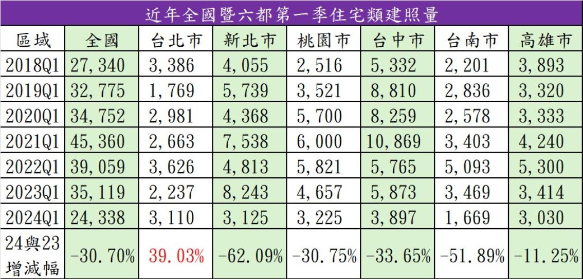 年初適逢總統大選、央行升息、國際政經局勢變化等因素,房市前景不明,不過因選後市況穩定,市場百花齊放,住商機構彙整內政部最新資料,全台2024年第一季住宅類建照核發數量達2萬4338戶,為2018年以來最低。住商不動產企劃研究室執行總監徐佳馨分析,房市雖說延續去年底「新青安」貸款熱度,不過土建融管制仍在,且央行各界預測將進入升息循環,使得建商推案腳步較為趨緩。