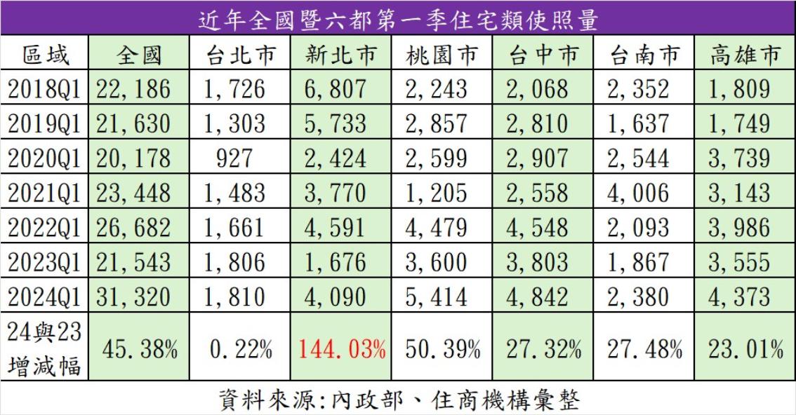 使照方面,據內政部資料,全台住宅類使照核發宅數達3萬1320戶,為歷年同期最高。