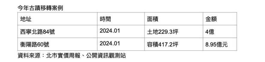 此次揭露顯示,西寧北路84號的茶廠今年1月底以總價4億元成交,土地面積229坪,土地成交單價每坪174.4萬元/坪,換算容積單價每坪58萬元,價格符合市場行情,曾敬德表示,北市的古蹟具有容移的優勢,雖然無法直接開發,但可以透過容移一樣有不錯的身價,例如今年初也有開發商以8.95億元,處分古蹟名稱衡陽路60號店屋的可移轉容積。