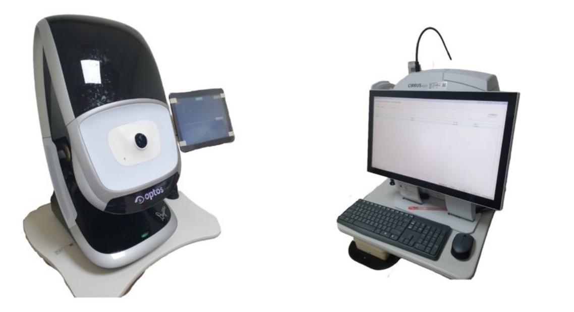 經初步檢查發現,患者右眼的矯正視力僅餘0.5,左眼則為1.0。間接眼底鏡檢查發現,右眼眼底呈現黃斑部出血與黃斑部漿液性色素上皮層下積水的現象,當天立刻安排光學同調斷層掃描儀檢查,發現右眼眼底呈現黃斑部下脈絡膜病灶,是以臨床上高度懷疑右眼老年性黃斑部病變合併出血,因此再進一步安排在一周後的螢光眼底血管攝影與循血綠脈絡膜血管攝影。