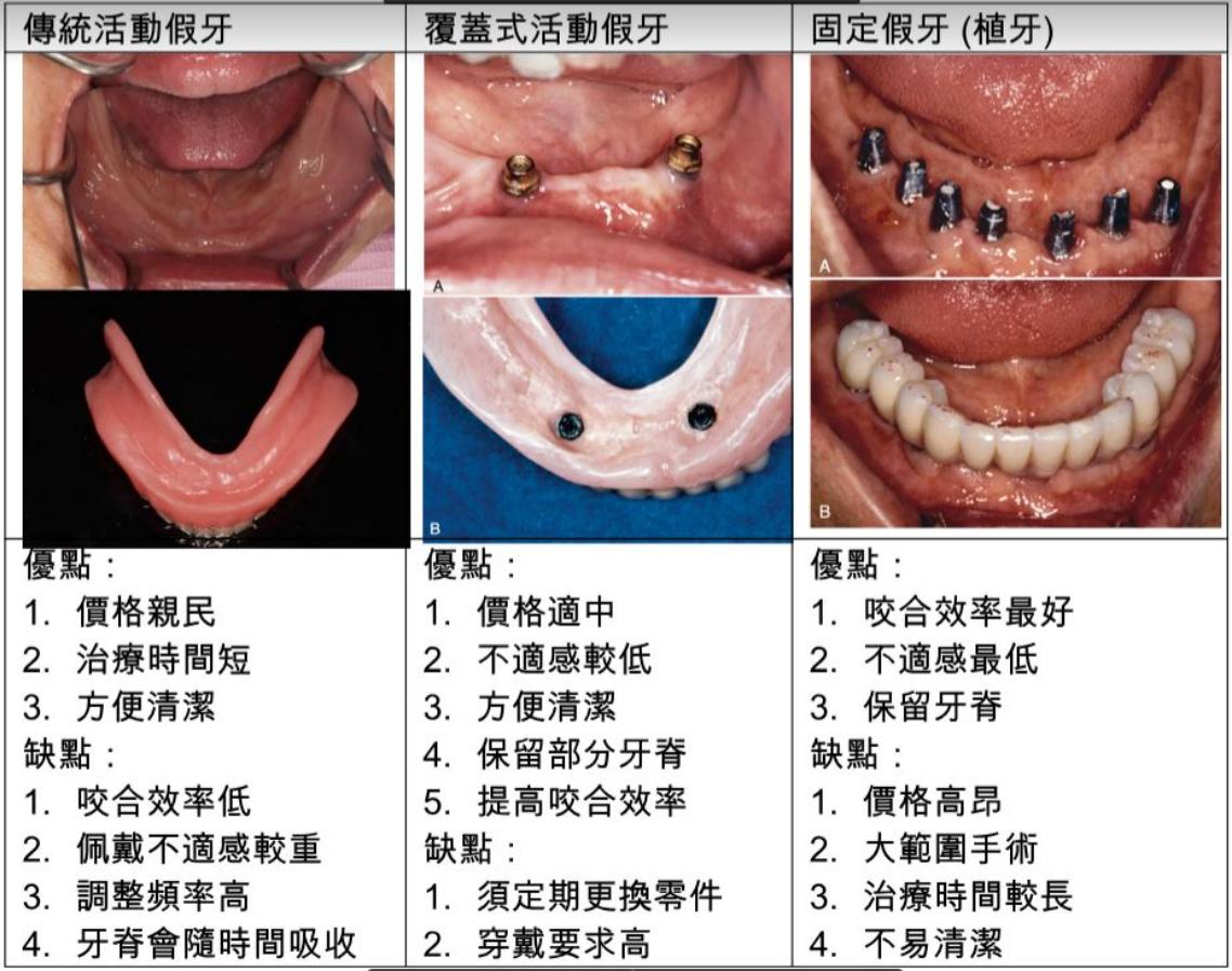 隨著材料的發展,開始有植牙的選擇,改善了咬合功能的問題,也能同時保存牙脊不被吸收,材料上也能選擇較耐磨的材質,但最大的缺點就是成本費用太高,加上大範圍的手術,讓病患避而遠之。