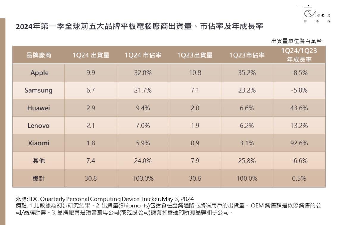 根據IDC(國際數據資訊)《全球個人運算裝置季度追蹤報告》(Worldwide Quarterly Personal Computing Device Tracker)的初步數據,在經歷了兩年多的衰退之後,2024年第一季(1Q24)全球平板電腦出貨量較去年小幅成長0.5%,總量達3,080 萬台。市場上一次出現成長是在2021年第二季,此後由於飽和,出貨量開始放緩。