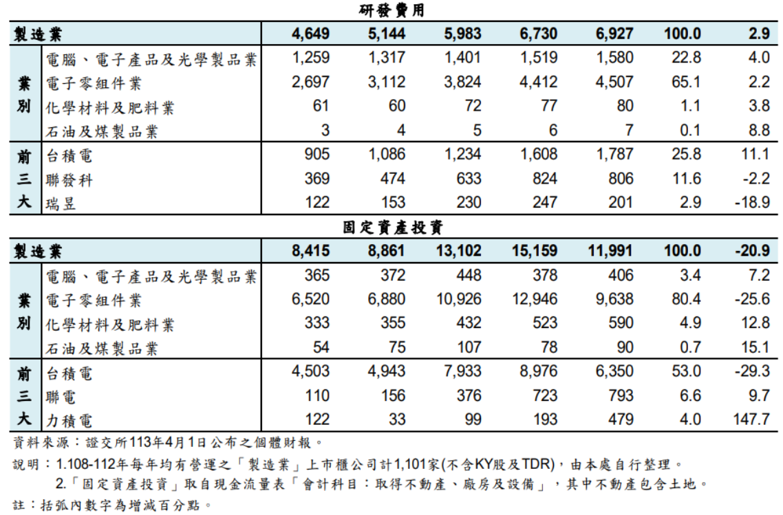 經濟部整理臺灣證券交易所公布、共計1101家上市櫃「製造業」公司 (不含 KY股及TDR)個體財報指出,雖然去(112)年上市櫃製造業的年營收及獲利皆呈年減態勢,不過研發支出創下歷年新高,而台積電就佔了四分之一;除了研發費用外,台積也在營業利率、固定資產投資拿下冠軍,堪稱「三冠王」。