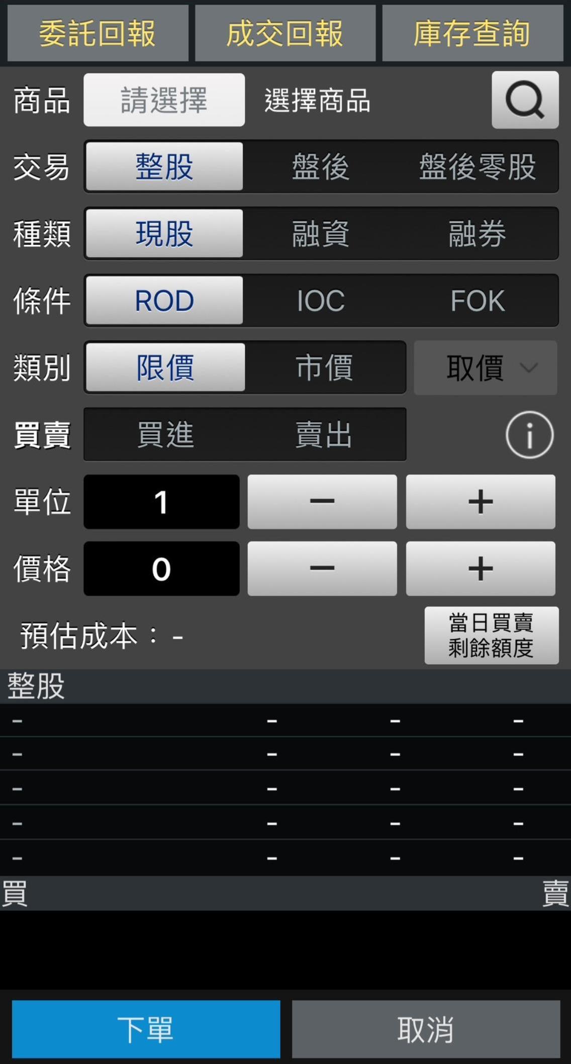 而下單條件中的ROD(Rest of Day)是一種常見的預設掛單方式,投資人假如想要讓掛單持續到收盤都有效,就使用ROD。而另外兩種較不常用的IOC(Immediate-or-Cancel)以及FOK(Fill-or-Kill)則分別是允許部分成交,而沒有成交的部分就取消;以及一定要全部成交,否則就全部取消的意思。在這之中,小白們只要使用預設的ROD就可以了。最後限價的意思就是「由投資人限定交易價格」。
