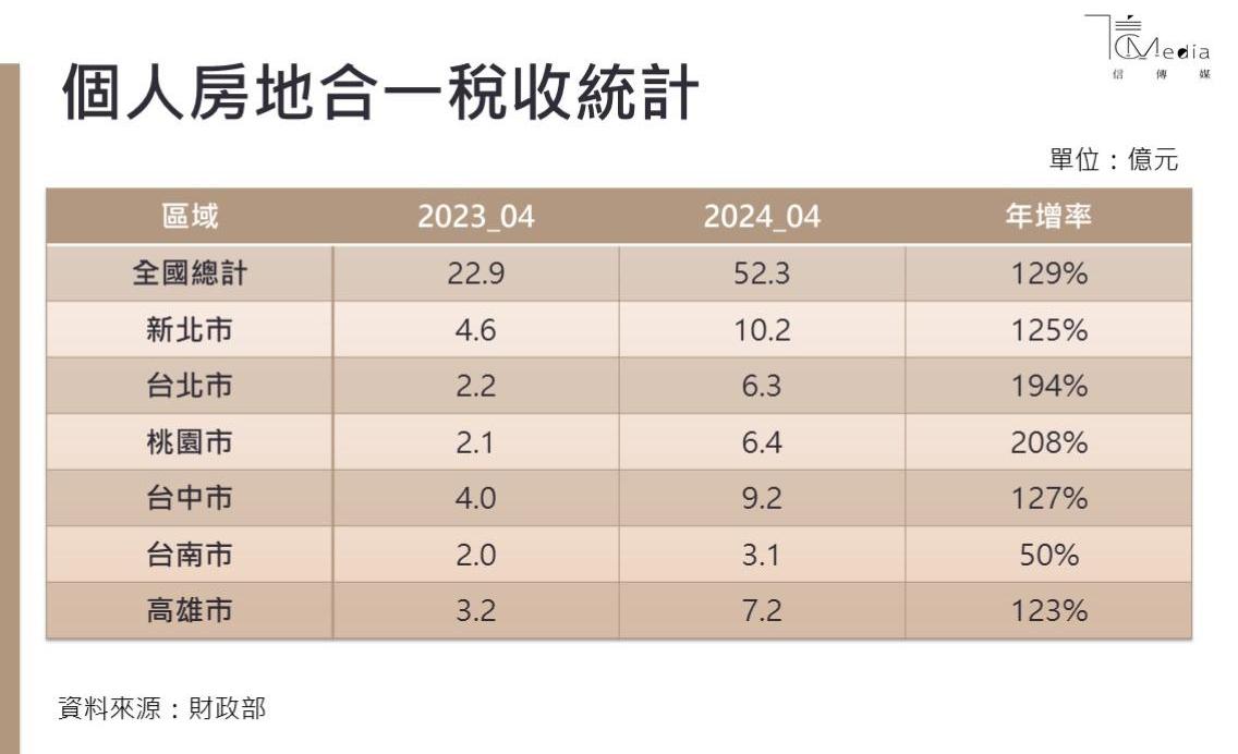 統計顯示,4月全國個人房地合一稅收52.3億元,年增率高達129%,顯示農曆年後房市交易狀況暢旺,買氣明顯優於去年同期,至於區域房地合一稅收表現,4月個人房地合一稅收王是新北市,房地合一個人稅收10.2億元,年增率125%,年增率最高的是桃園市,4月個人房地合一稅收6.4億元,年增達到2倍,台北市稅收6.3億元,年增率也達到194%。