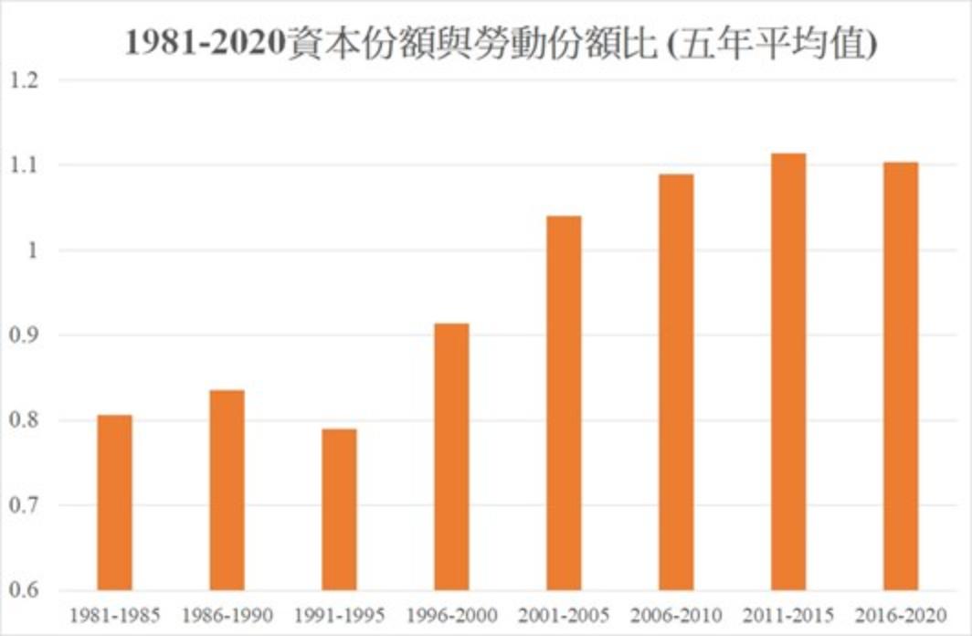 若以資本/勞動份額比五年平均值來看,1991-1995年民主轉型期間,公民參與及人民發聲機會大幅提升,亦是勞工運動蓬勃活躍的時期,勞動份額增加最快。所以,1991-1995年是資本/勞動份額比自1981年以來最低的期間(見上圖)。