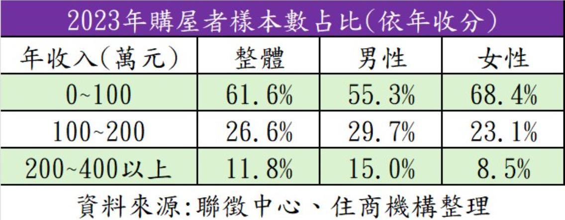 近年來低總價小宅成為市場主流,吸引首購族買房,不過住商機構彙整聯徵中心資料,2023年的購屋者中,年收入低於百萬元的族群占約6成;其中,女性購屋者年收低於百萬者,占比更達近7成。