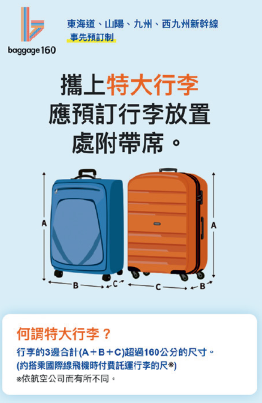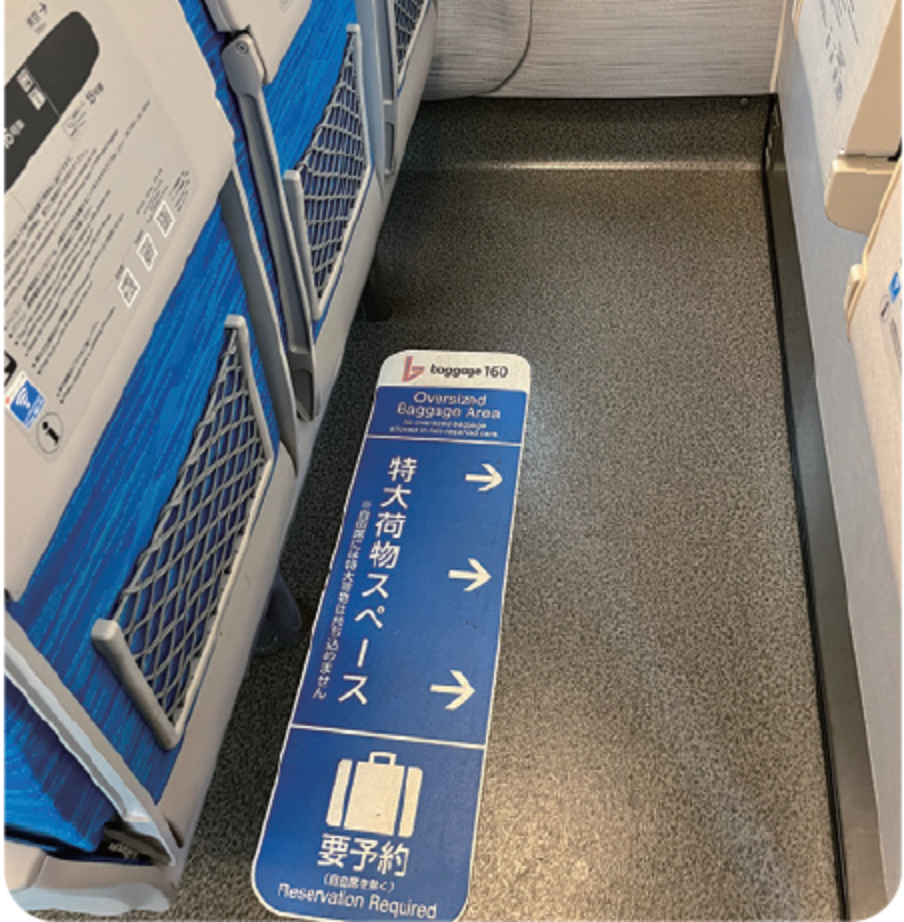 搭JR新幹線(九州∼東京)帶大行李需事先預約專用座位「大行李放置處附帶席」。一般來說,一節車廂只有5個這樣的座位,通常是最後面的位置,以往搭車帶大行李搭新幹線,不少人都會直接把行李放在這個空間,但現在規定有改,已經不能隨意放置大行李。因為這有可能是別人已經預定好的座位,需要使用這位置的話就要事前先預約喔!
