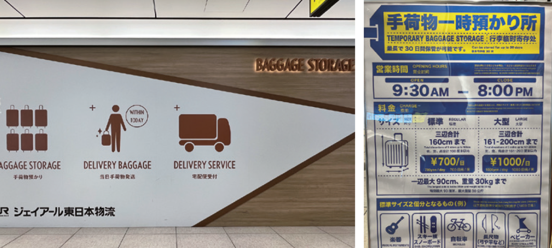 東京車站內有個行李寄放處,可以過夜寄放行李,一咖行李箱三邊長總計160公分內,放置一天的費用是日幣700,161 ∼200公分的費用為日幣1,000。如果是寄放樂器、滑雪板、腳踏車、娃娃車、釣竿,費用是日幣1,400。每天早上9:30 營業至晚上20:00,超過時間就會累計多一天費用喔,最多可以放置30天。