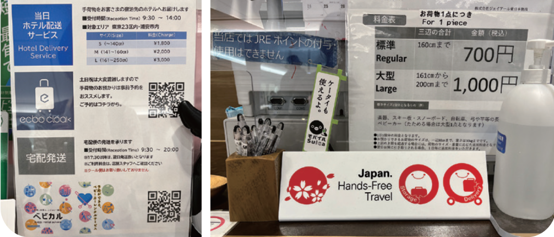 目前日本正大力推廣一下機就開始「空手旅行」(Hands Free Travel),所以也有幾間物流業者在機場提供寄送行李到飯店的服務,像是宅急便和JALABC。主要用意是希望旅客能夠更輕鬆的遊玩,一到日本就不被行李拘束,不用先到飯店放行李,也不需沿路找置物櫃。特別是帶小朋友的父母,又要推小孩又要推行李,非常適合先把行李拿去宅配,就只要顧小孩就好。不過,如果希望當天送達飯店,需要在當天中午12:00前將行李交給物流業者才行,超過12:00就會隔天才到,想利用的朋友請多留意,如果住宿會換飯店的話就不太適合喔!寄送行李的價格依尺寸而有不同,我28 吋的行李箱寄送是日幣2,400。提供給大家參考!