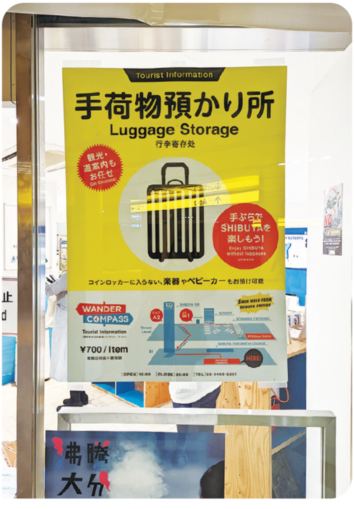 澀谷站也有個旅客服務中心,可以過夜寄放行李,地點在站內A3出口對面,每天早上10:00營業至晚上20:00,放置一天的費用也是日幣700。