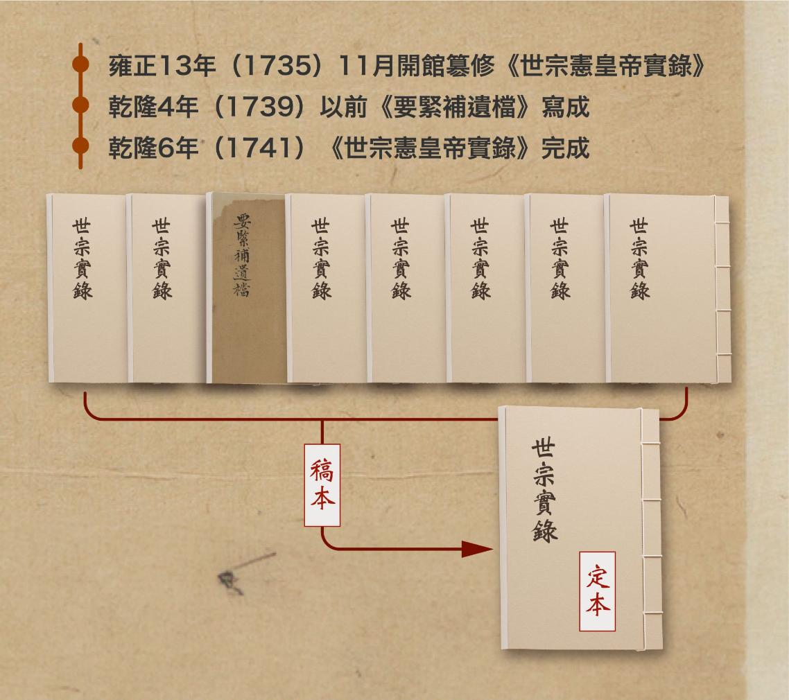 究竟是什麼事那麼「要緊」,非得特別寫成一份檔案?經多方比對後發現,《要緊補遺檔》應是編寫《世宗憲皇帝實錄》的眾多稿本之一,大約在乾隆 4 年(1739)以前寫成,主要用來修訂康熙、雍正兩朝交接前後近 40 天的記載,當中藏有乾隆帝對父親繼位疑雲的處理態度。
