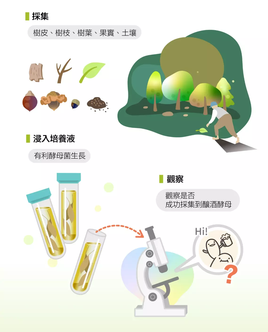 要研究野生的釀酒酵母,第一步當然是去野外採集,可是人的眼睛看不見酵母菌,所以沒辦法用視覺辨識直接採樣,要把樣本帶回實驗室,初步處理後浸入培養液,等待兩個星期才能得知結果:釀酒酵母是否存在。