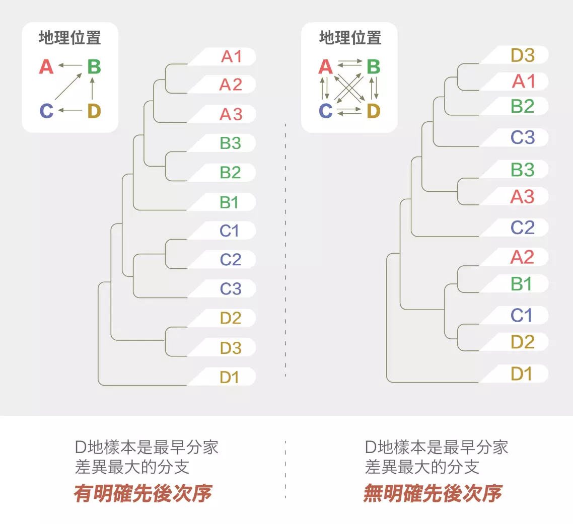 演化樹是一種建構親緣關係的工具,所有樣本中,兩個樣本假如有最近的共同祖先,通常遺傳上的差異也會愈少,便會被歸類到一塊;這一批和其次相近的另一批樣本們,又會被歸類到一群,就這樣一直向前回溯(見下圖),形成看似樹狀的關係。而這棵樹上愈早分離的譜系,也就代表差異愈大,愈早和其他樣本分家。