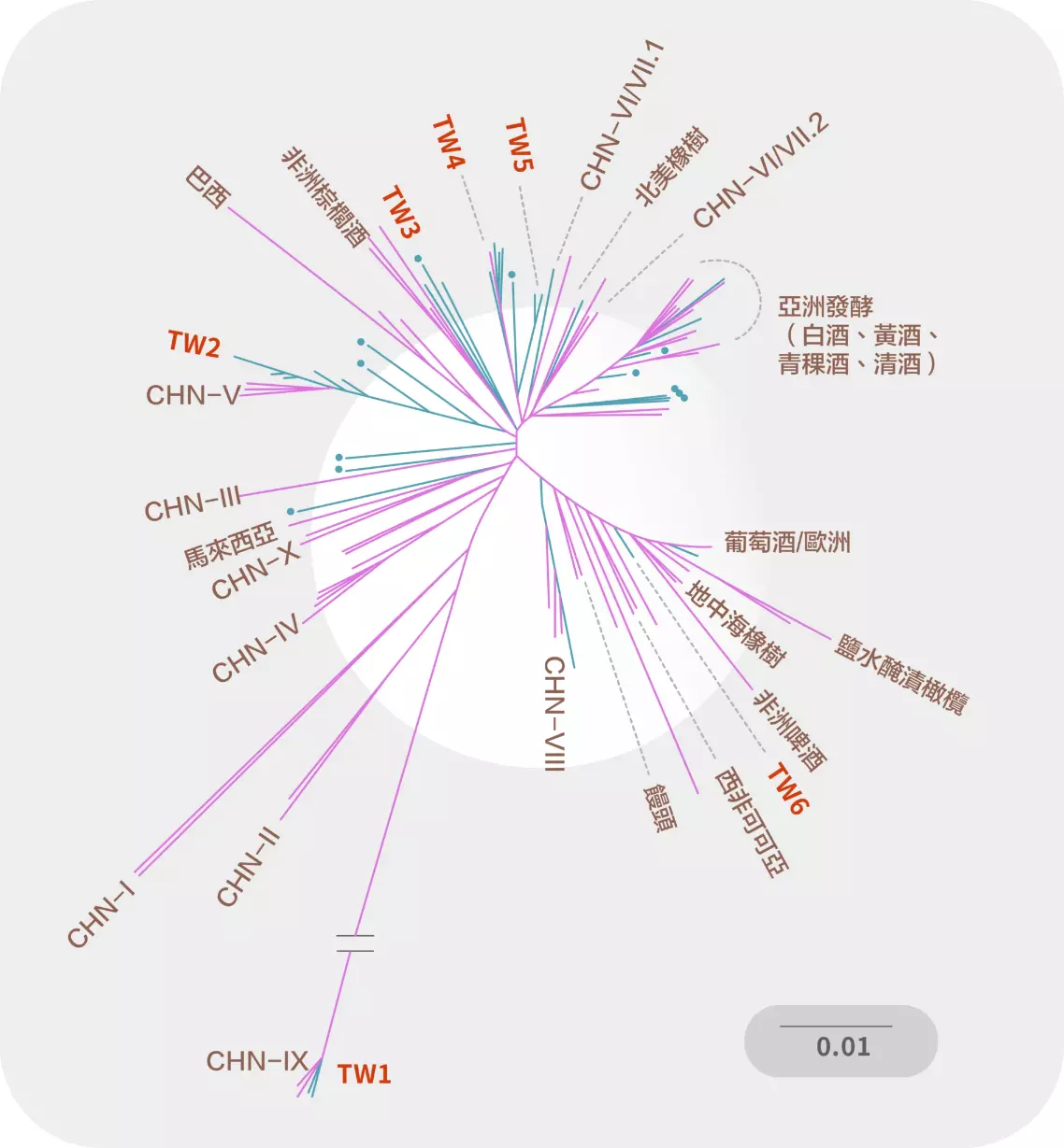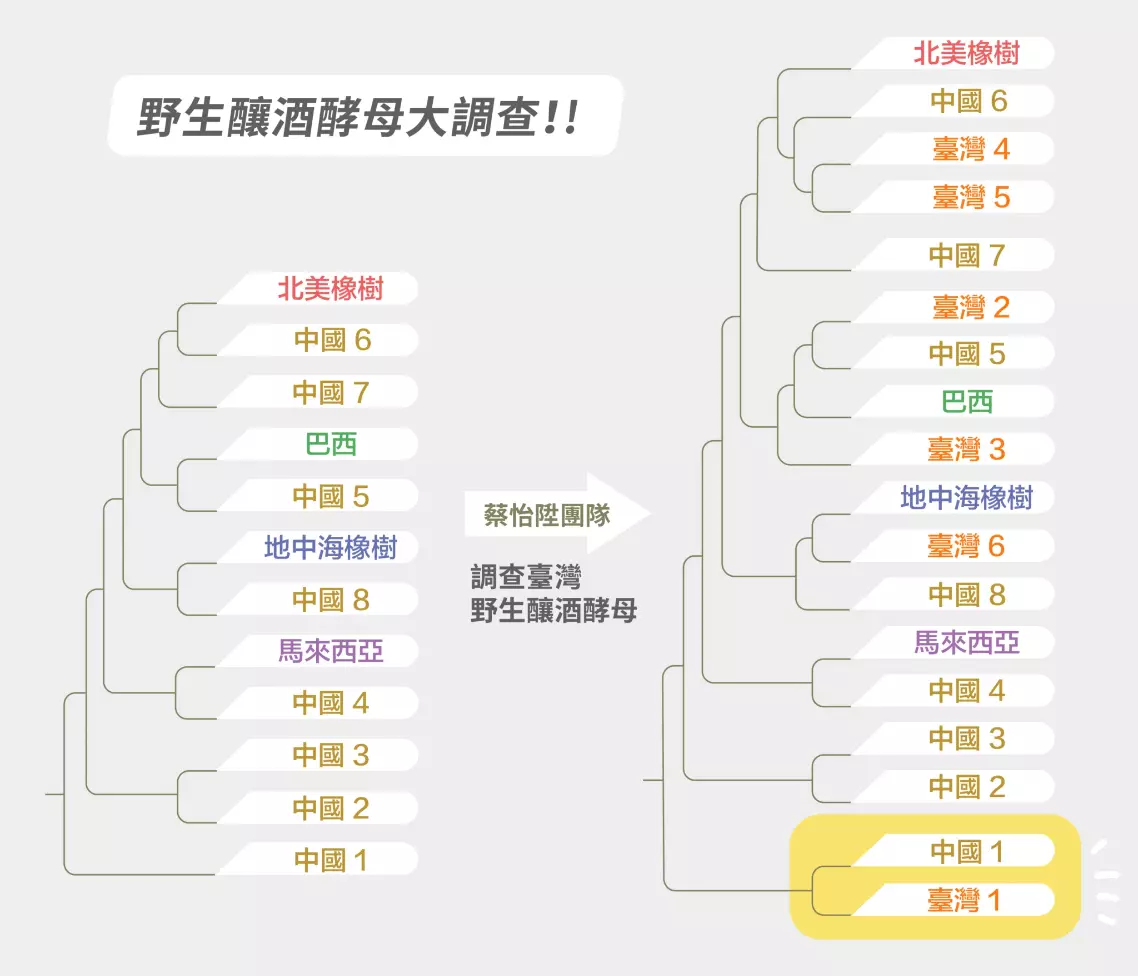 2018 年就有研究者從世界各地收集超過一千個釀酒酵母品系,探討親緣關係。分析發現野生釀酒酵母們彼此的變化差異還不小,東亞的中國為最多變之處;將所有酵母菌擺在一起畫演化樹,中國採集到的品系能歸類到不同譜系(lineages),包括與同類最早分家,差異最大的譜系。