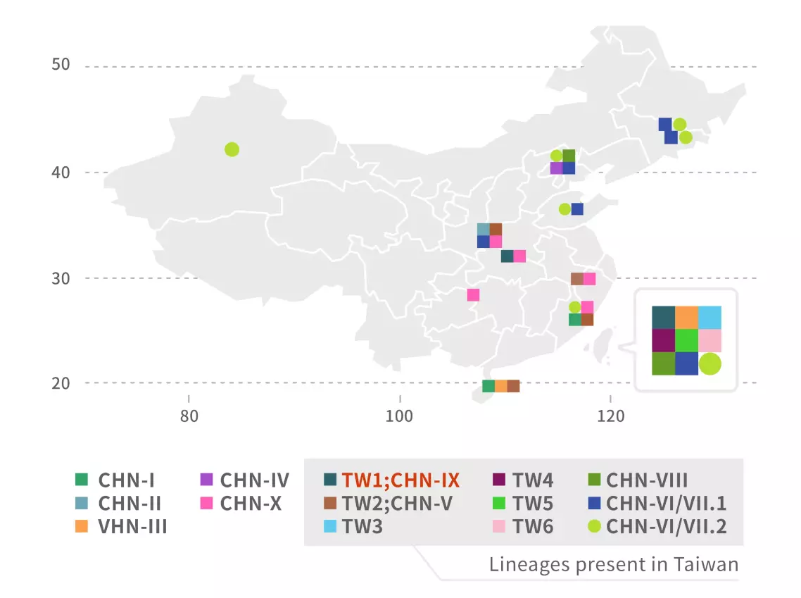 將臺灣的一百多個菌株擺進演化樹,驚奇的事發生了!臺灣存在的釀酒酵母們,竟然也被歸類進各大譜系,並有新的譜系,這表示臺灣的釀酒酵母多樣性,和中國一樣高。而且還有一款進入之前於中國採集到,與同類最早分家的那一群。