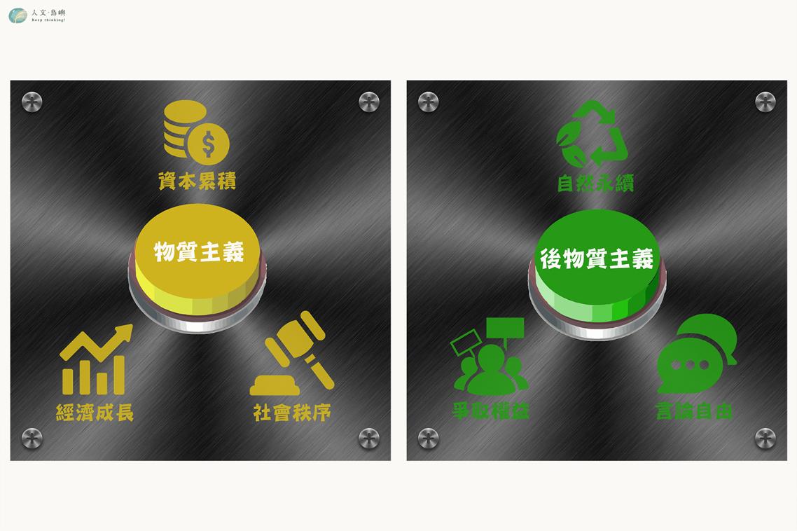 物質主義、後物質主義的對立,涉及一個人對國家乃至世界未來走向的宏觀期許。特別在資本主義發達的今日,兩種價值觀的最大不同,在於面臨「經濟發展」及其諸多代價的兩難下,如何做出大相逕庭的價值判斷。相對於追求經濟穩定成長、集體秩序安定、注重國家安全的「物質主義」,「後物質主義」更重視人的自主性、保障言論自由、自我實現、公民參與、環境永續。一言以蔽之,後物質主義的箴言就是:「自由意識表達比金錢更重要」。