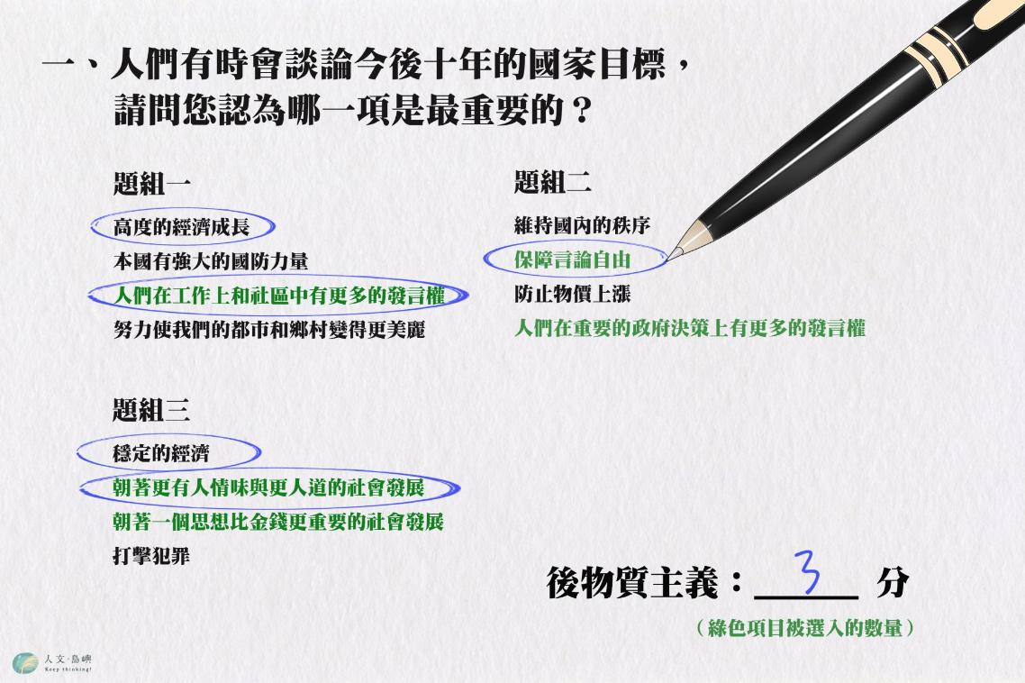 受訪民眾在三個題組中,分別從四個國家重要發展目標選出兩個「優先目標」。只要計算每個人在12個目標中,選出了幾個屬於後物質主義的選項,即為個人的後物質主義價值分數。三個題組中共有5個選項屬於後物質主義,因此每個人的最高得分是5分;最低則為0分。接著,只要將國內樣本的數據取平均值,便能得出該國的後物質主義分數,意味著該國人民在多大程度上會將「發言權」或「人道」的價值排序擺在「經濟發展」之前。