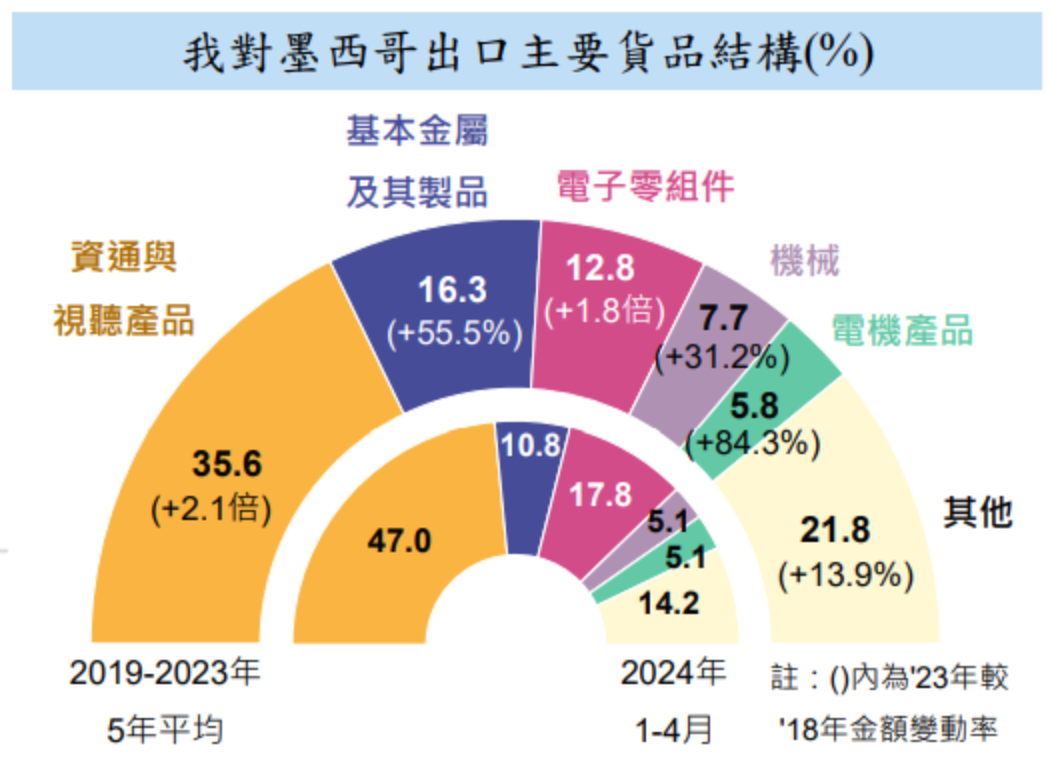 台灣對墨西哥的出口貨類用途主要屬中間產品,例如,電子零組件可能被組裝成電腦、手機或其他電子設備,資通與視聽產品可能被組裝成電視、音響或其他家用電器;至於基本金屬可能用於製造汽車、機械設備或其他工業產品。