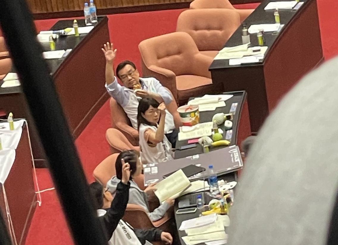 除了出現朝野立委在議場內吃芭樂的逗趣畫面,時間接近中午,當主席台周遭的朝野立委持續對抗,民進黨不斷高喊「反黑箱,反擴權,要審查」等口號時,民眾黨團副總召黃珊珊、立委陳昭姿、林國成、張啓楷坐在座位上吃著連鎖速食店的桶裝炸雞,議場內都是炸雞的香味。