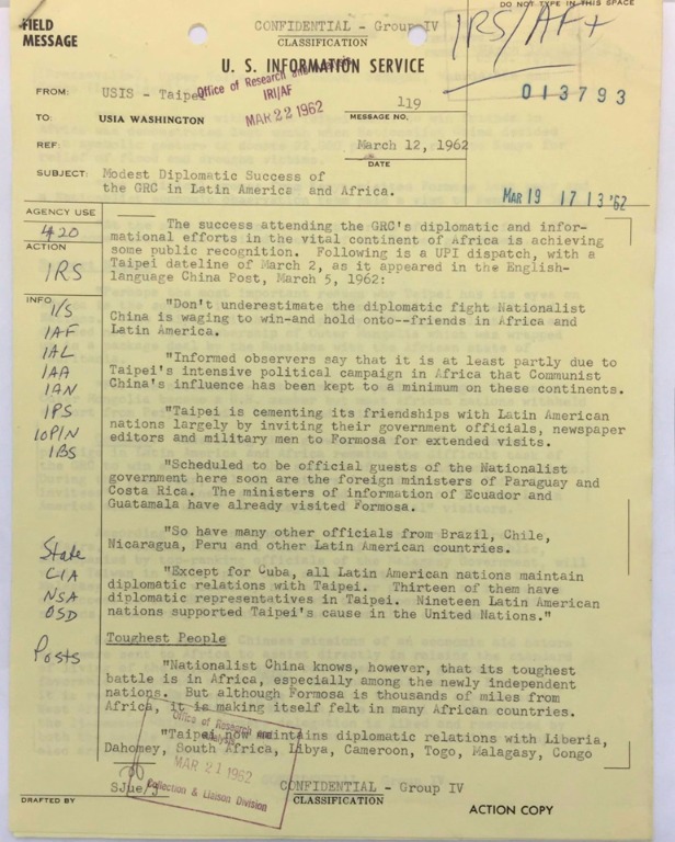 至於卡提斯為何這麼喜歡提到蔣介石?原來有其原因,由旅美台人成立的「國家寶藏」臉書專頁,專門挖掘流落海外的台灣歷史文件,建立網路開放資料庫,成為每個台灣人重新認識台灣歷史的寶藏,專頁13日就引用一份美方機密文件,揭密卡提斯提及3次蔣介石背後的因素。事實上,這份1962年美國在台灣情報單位傳回給華盛頓的機密文件(confidential),主題就是中華民國政府在拉丁美洲與非洲的外交關係有不錯的成就。
