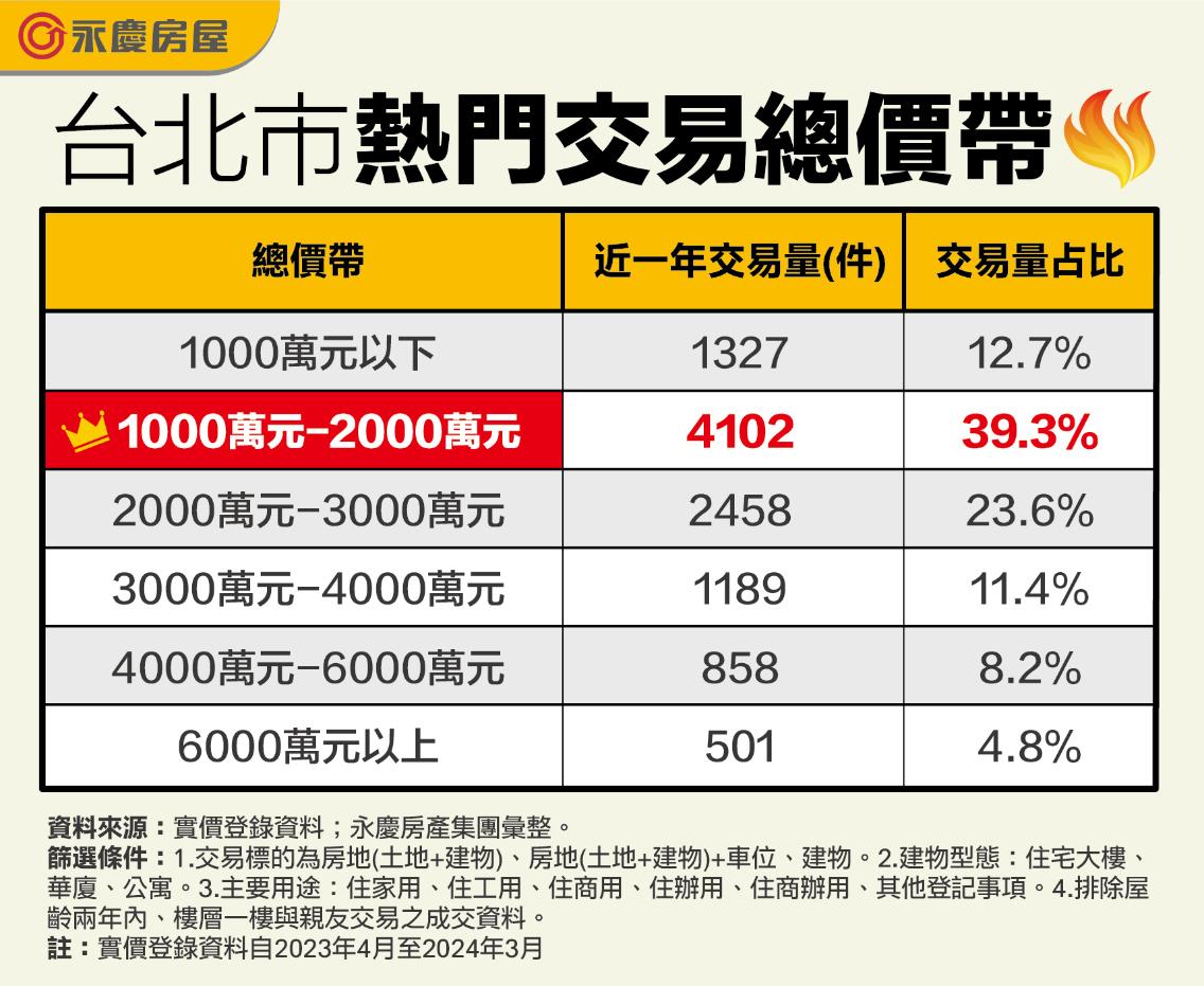 台北市房價雖然位居全國之冠,普遍認為台北市購屋總價高昂,但是根據統計,總價1000萬元至2000萬元的住宅仍是台北市交易主力,總價2000萬以下占比更逾五成。