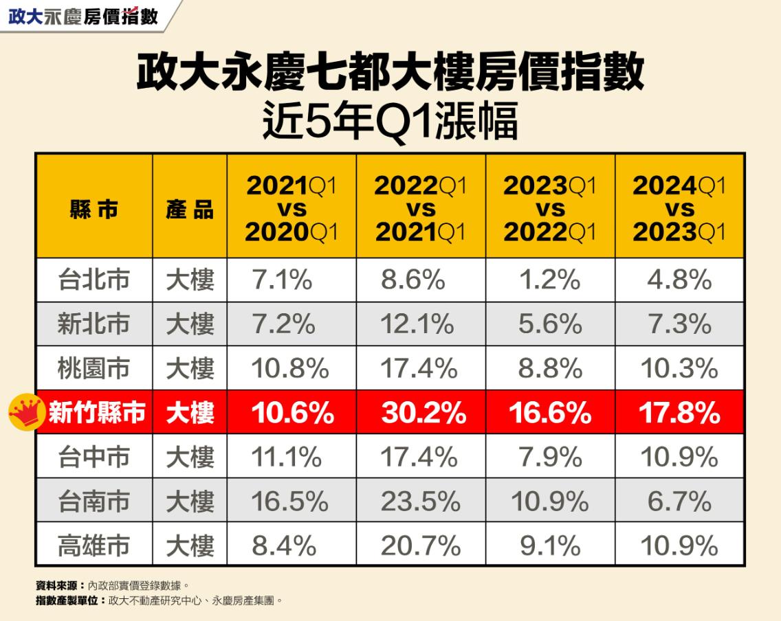 2024年Q1的「政大永慶七都大樓房價指數」和「政大永慶雙北公寓房價指數」出爐。數據顯示,2024年Q1七大都會區大樓房價指數漲勢再起,其中桃園、新竹、台中、高雄年漲幅皆超過一成,新竹縣市房價指數近五年漲幅更是年年均達雙位數。比較雙北地區的大樓和公寓產品房價指數變化,受益於經濟前景看好抬升整體房市熱絡,使2024年Q1雙北大樓和公寓齊漲,房價指數漲幅未有明顯差異。