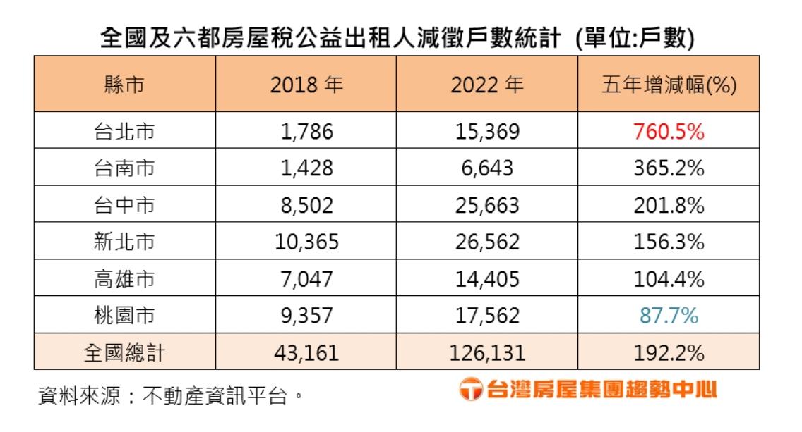 房屋出租既能收租還能省稅!台灣房屋根據內政部不動產資訊平台資料,統計近五年房屋稅公益出租人減徵戶數,2022年全台12.6萬戶房屋,因房東成為公益出租人而減徵房屋稅,足足比2018年的4.3萬戶增加近兩倍。而近五年六都的減徵戶數幾乎都倍數成長,其中以台北市的增幅最可觀,從不到2000戶增至約1.5萬戶,增加近8倍,增幅最少的桃園也成長近9成,減徵戶數最多的則是新北市,2022年逾2.6萬戶房屋享有公益出租減稅優惠。