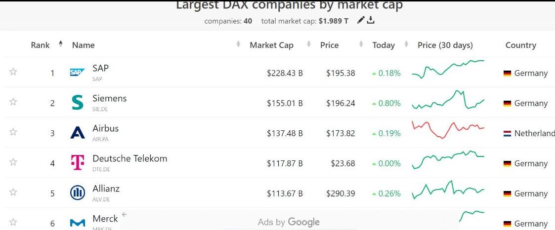 事實上,德國股市市值排名大到小依序為SAP、西門子、空中巴士德國公司、德國電信、安聯金融集團、默克集團、賓士、保時捷、福斯汽車,這意味著德國舉世聞名的汽車工業、電信電子的西門子,都無法和世界潮流的AI晶片股輝達相比。