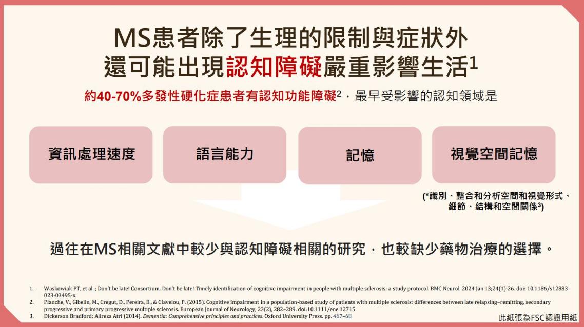 徐榮隆直言,約有40-70%的多發性硬化症患者會出現認知功能障礙,患者的大腦會加速萎縮,「根據研究指出,復發緩解型的患者大腦容積流失速度每年約為0.5%-1.35%,約是一般30歲左右正常人的5倍!甚至影響認知、心智功能,可能會出現閱讀時找不到字、無法同時處理多項工作,甚至記不得長相或名字,影響日常生活。」