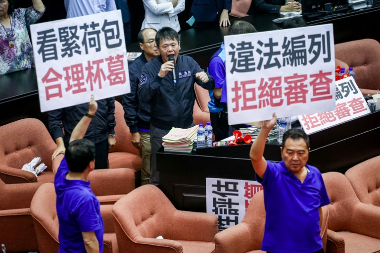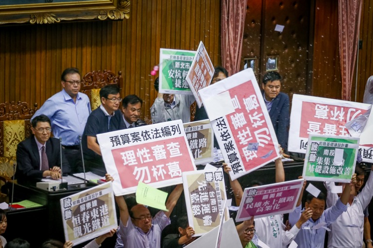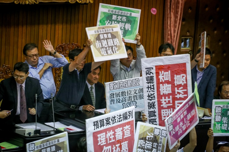 國民黨委員佔據著發言台,強力杯葛前瞻特別預算案,高喊「違法編列,拒絕審查!」
