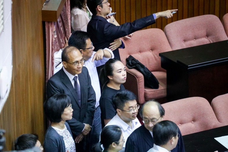 早上9時會議開始,行政院長林全走進議場後卻無法到位子上,只能站在旁邊目睹混亂的議場。