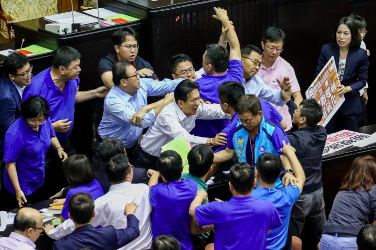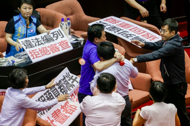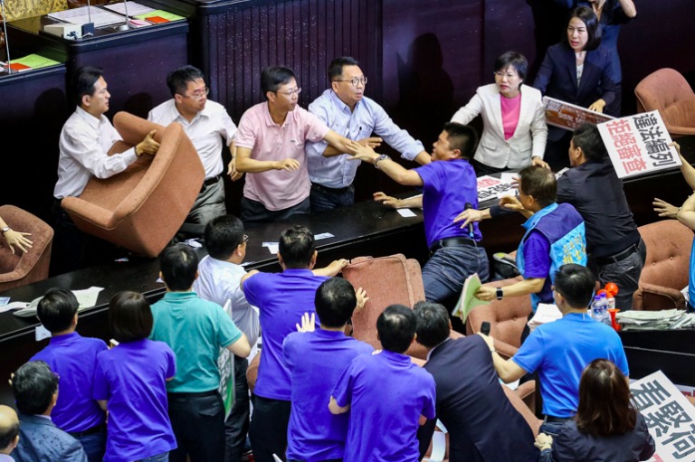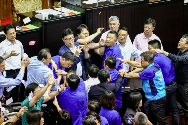 國民黨立委費鴻泰與民進黨立委李俊俋扭打在一起。