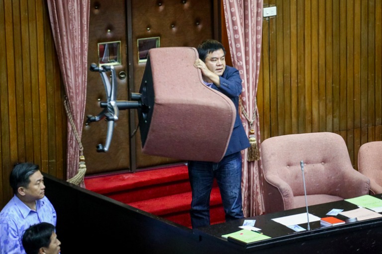 民進黨籍立委莊瑞雄舉起椅子作勢要往下砸。